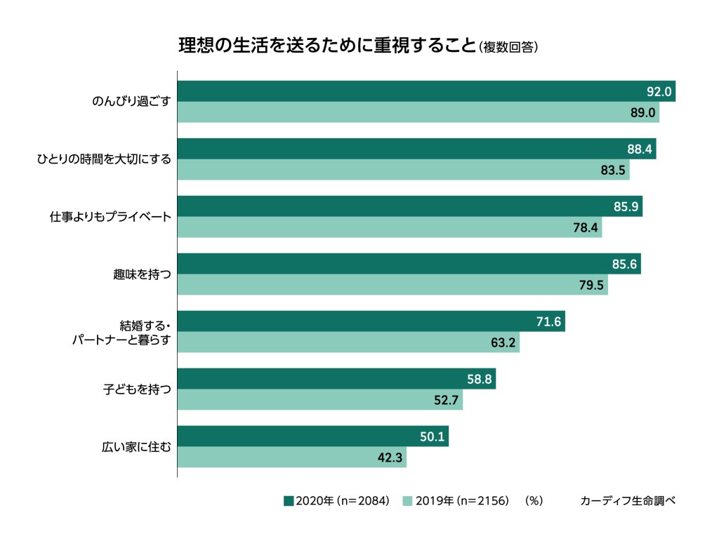 - 理想の生活を送るために重要視することのなかで、昨年より大きく上昇したのは、「仕事よりもプライベート」(86% 昨年比+7.5pt)、「趣味を持つ」(86% 同+6.1pt)、「結婚する・パートナーと暮らす」(72% 同+8.4pt)、「子どもを持つ」(59% 同+6.1pt)、「広い家に住む」(50% 同+7.8pt)。コロナ下での行動制限により家で過ごす時間が増えたことで、より生活を重視する傾向が高まったと推察される。(図表1)