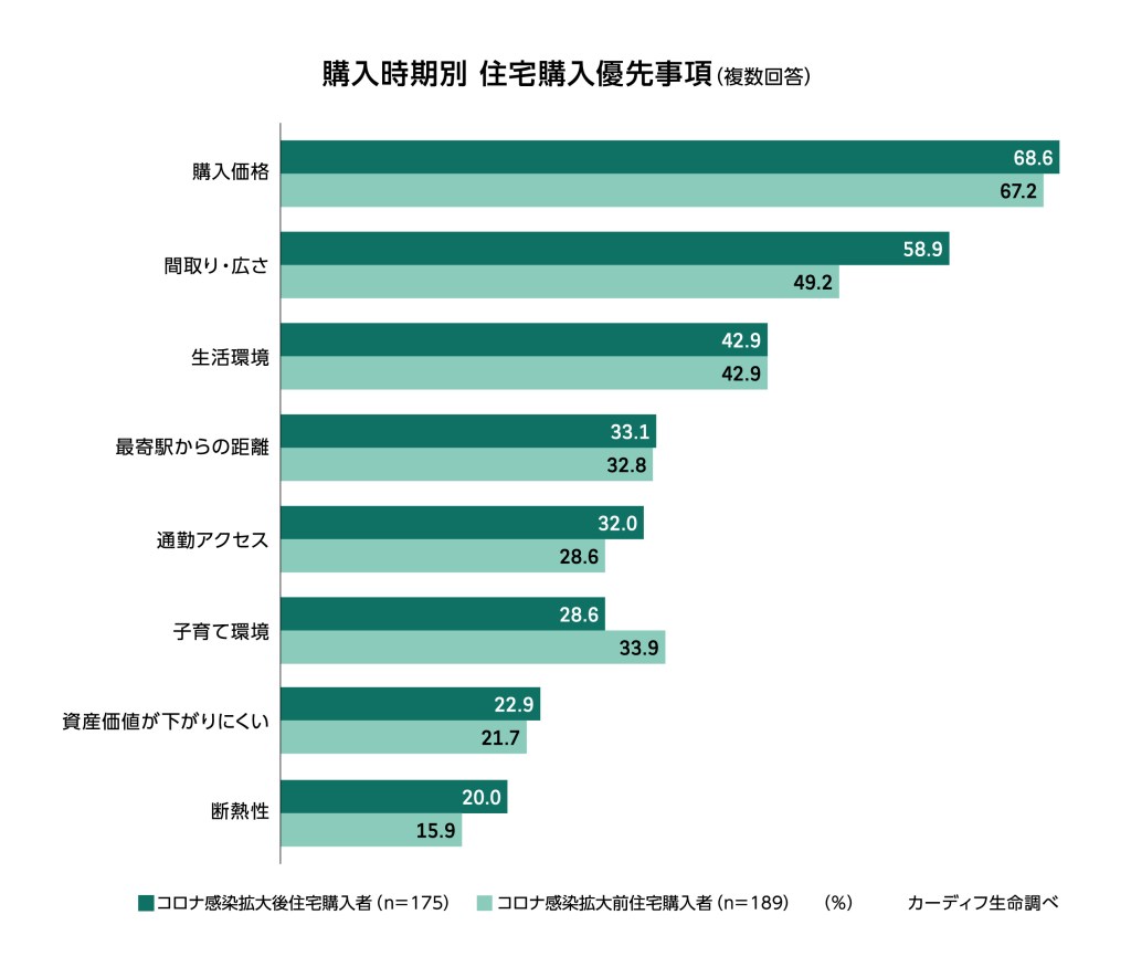 - コロナ感染拡大後に住宅を購入した人は、コロナ感染拡大前(2015年~2020年2月)に購入した人と比較して、「間取り・広さ」(59% コロナ前比+9.7pt)、「通勤アクセス」(32% 同+3.4%)、「断熱性」(20% 同+4.1%)を優先する傾向がみられた。(図表10)
