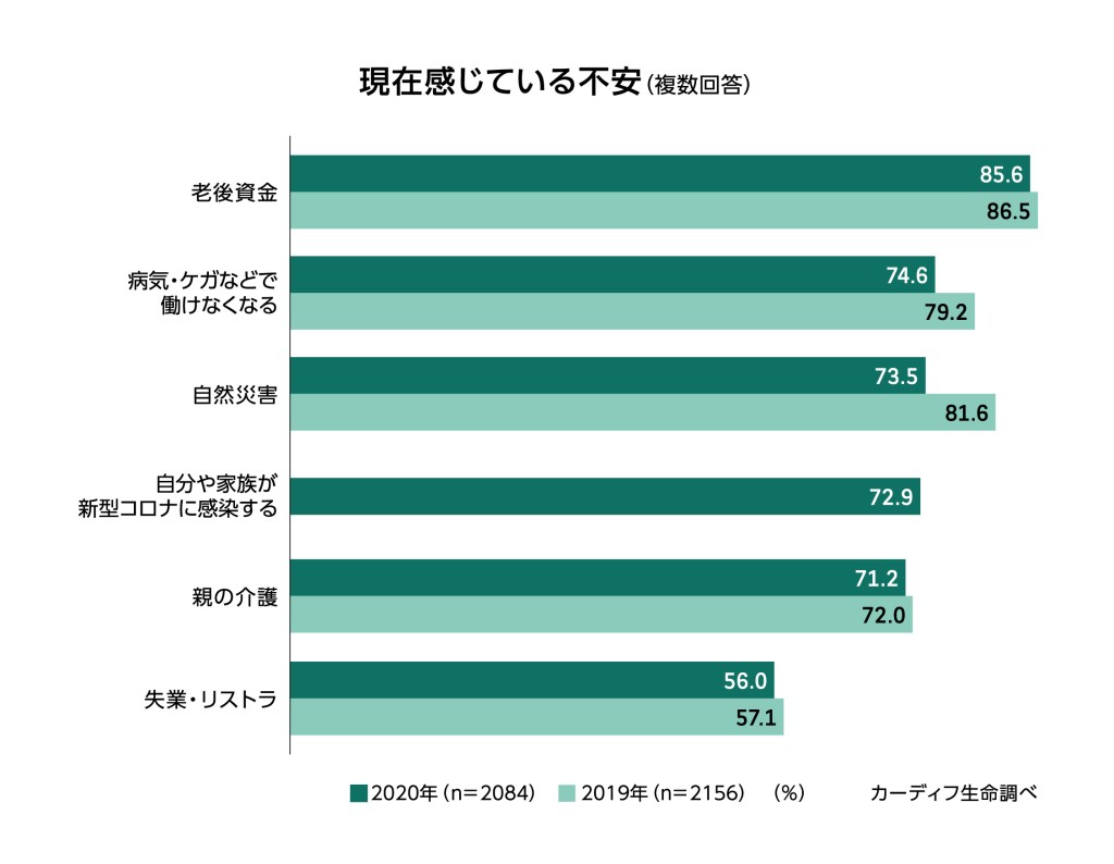 2.コロナ下でも生活の最大の不安は「老後資金」(86%)。新型コロナ感染への不安は73%