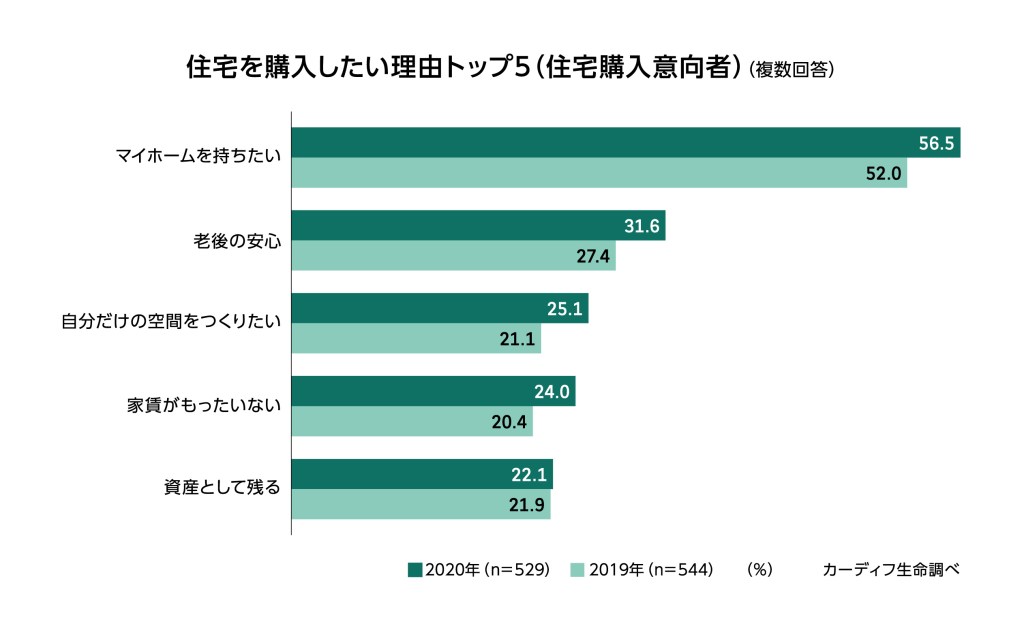 - 住宅を購入したい理由は、「マイホームを持ちたいから」(57%)、次いで「老後の安心のため」(32%)、「自分だけの空間をつくりたい」(25%)(図表7)。一方で、テレワーク経験者は、「マイホームを持ちたいから」(55%)がトップで変わらないが、「老後の安心のため」(37%)と「資産価値として残るから」(31%)の割合が高く、将来を見据えて検討していることがうかがえる。