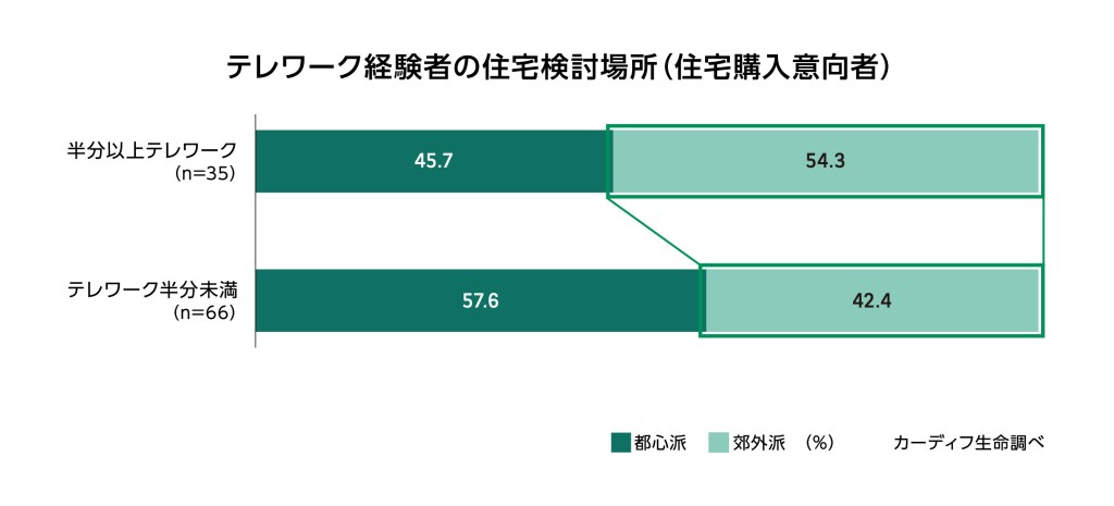 - 一方、テレワーク経験者についてはテレワークの頻度によって差がみられた。「半分以上テレワーク」は「郊外派」(54%)が「都心派」(46%)より高く、「テレワーク半分未満」は「都心派」(58%)が「郊外派」(42%)よりも高い。(図表9)