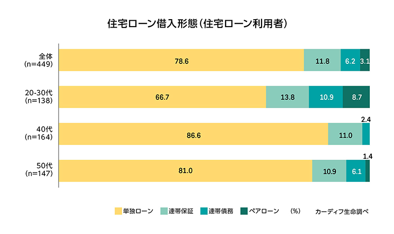 - 一方、20~30代では「単独ローン」は67%にとどまり、パートナーなどとの収入合算が3割強を占めた(「連帯保証※8」(14%)、「連帯債務※9」(11%)、「ペアローン※10」(9%))。