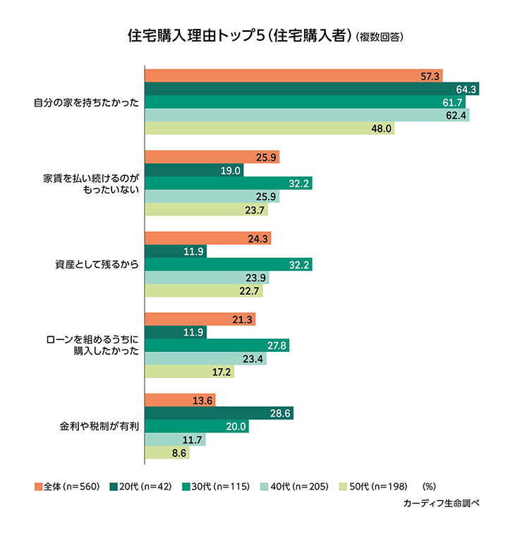 「自分の家を持つ」73%(昨年比+9.6pt)、「広い家に住む」64%(同+4.5pt)、「自分の車を持つ」63%(同+4.7pt)、「贅沢な食事をする」62%(同+9.6pt)、「人とは違う選択をする」61%(同+4.8pt)、「人から羨ましがられることをする」54%(同+8.2pt)、「人より早く出世する」49%(同+10.3pt)(図表3)。 - 住宅を購入した人の購入理由では、「自分の家を持ちたかった」57%(昨年比+3.2pt)、次いで「家賃を払い続けるのがもったいない」26%(同+0.3pt)、「資産として残るから」24%(同+2.7pt)、「ローンを組めるうちに購入したい」21%(同+5.6pt)(図表4)。特に30代では、「資産として残るから」32%(昨年比+11.8pt)、「ローンを組めるうちに購入したかった」28%(同+13.2pt)、「金利や税制などが有利で買い時だと思った」20%(同+8.3pt)と、マネーへの意識の高まりがうかがえる。