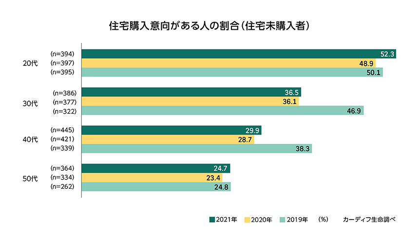 - 住宅未購入者のうち、「住宅を購入したい」と回答した人は36%(昨年比+1.3pt)で昨年よりも上昇したが、コロナ前の2019年(41%)よりも低い割合にとどまった。