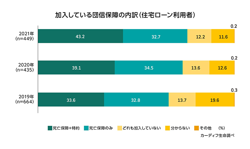 - 住宅ローン利用者のうち団信の特約に加入している人は43%(昨年比+4.1pt)で、年々上昇傾向にある(図表9)。20~30代では53%と、若年層ほど高い。また、コロナ下で住宅を購入した人の61%が特約に加入していた。