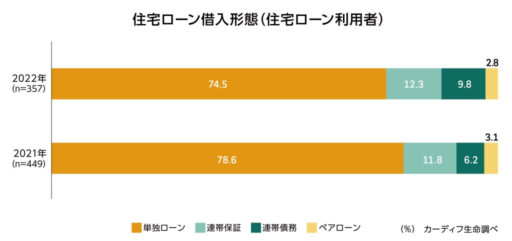 - 住宅ローンの借入形態は、「単独ローン」が75%と依然として大多数を占めているが、昨年比では4.1ptの減少(図表4)。