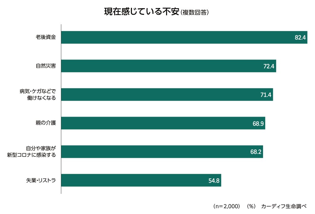 - 最大不安は全世代で「老後資金」(82%)(図表1-1)。 20代は75%、50代では86%の人々が、人生100年時代を生き抜くための将来のお金に不安を感じている。