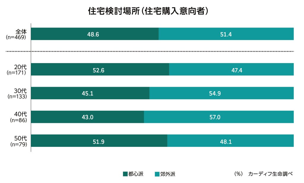 - 住宅購入意向のある人のうち、「都心派」は49%、「郊外派」は51%と拮抗(図表3-2)。