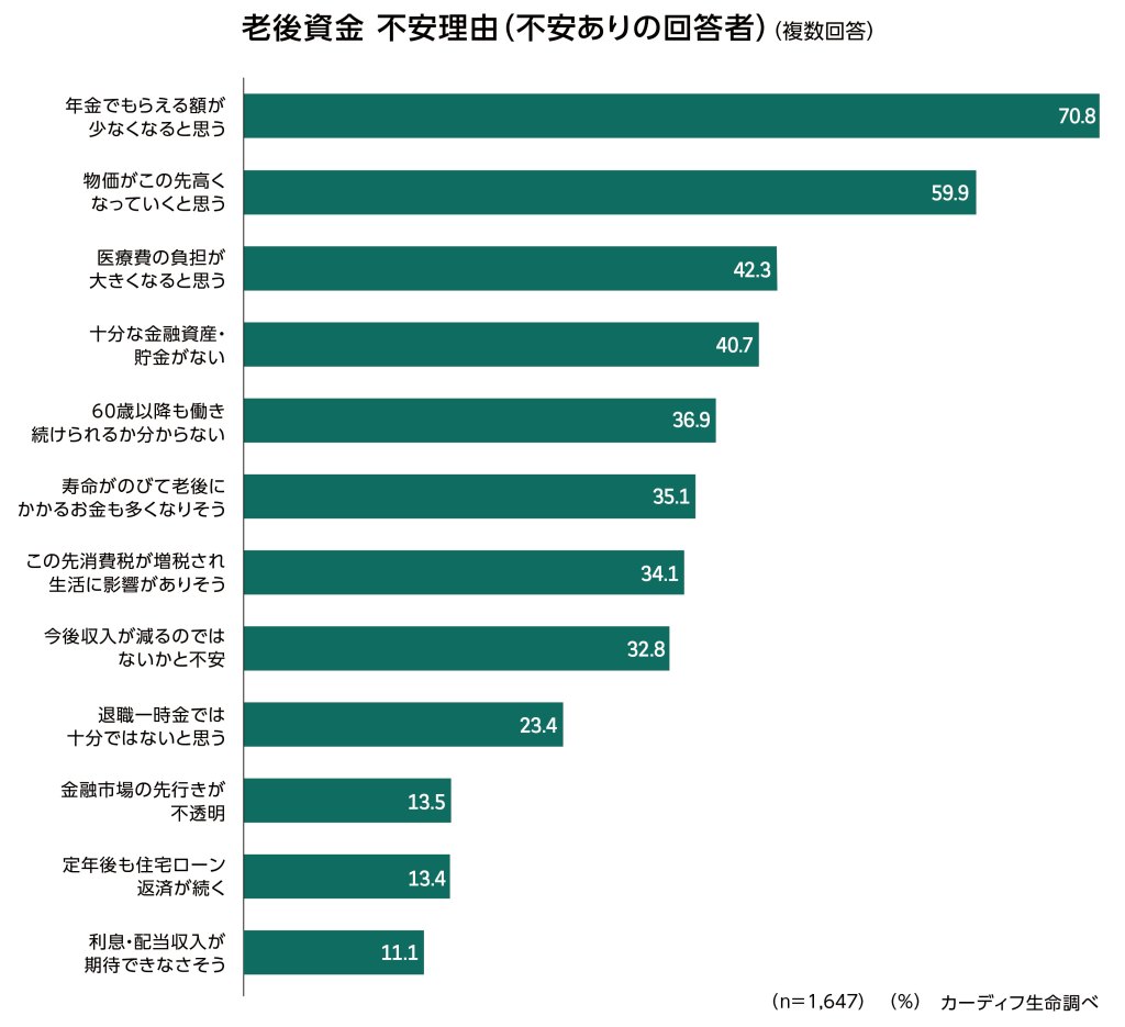 1. 「老後資金が不安」は8割超。主な理由は「年金額の減少」、「将来の物価上昇」、「医療費負担の増大」