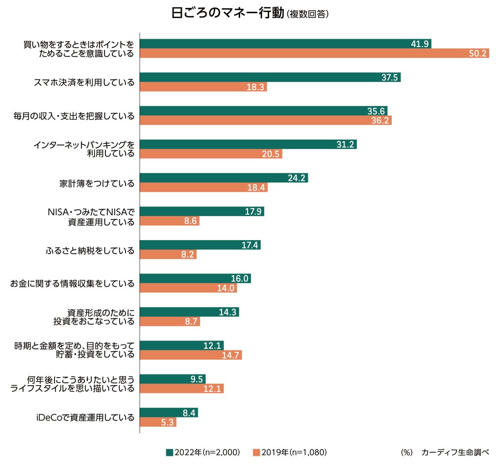 - 日ごろのマネー行動では、新型コロナ前と比べて「スマホ決済を利用」(38% 2019年比+19.2pt)、「NISA・つみたてNISAでの資産運用」(18% 同+9.3pt)、「ふるさと納税」(17% 同+9.2pt)の各項目で2倍以上に増加(図表2)。