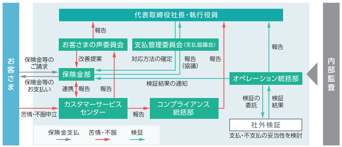保険金・給付金のご請求に対するお支払いの可否は、複数の保険金部担当者による審査を経て決定します。決定後、お支払いの可否に関わらずすべてのご請求案件を社外機関が検証し、その結果をCOOオフィス部が確認します。また、決定に疑義がある場合は、社内の関係部門責任者で構成される「支払協議会」にて対応を協議するなど、適切にお支払いするための態勢を整えています。